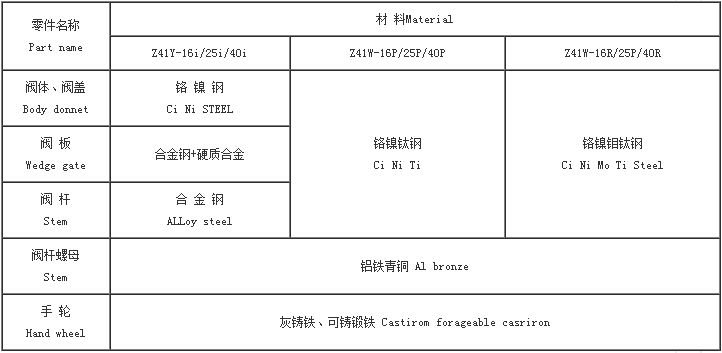 傘齒輪不銹鋼閘閥主要零件材料 Material for main parts