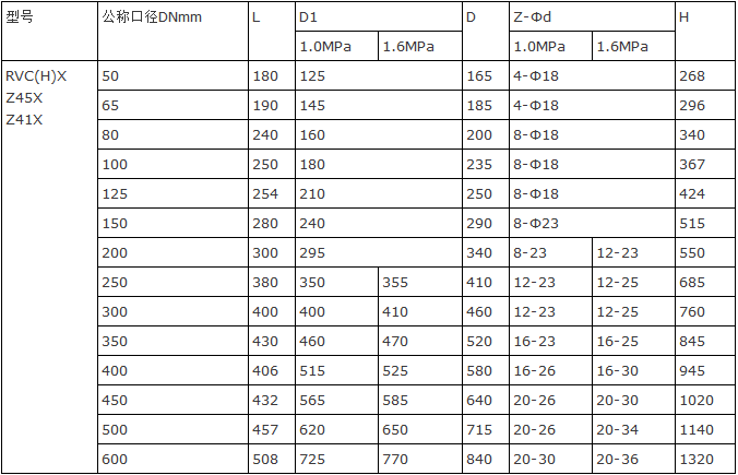 Z45X、RVCX埋地式彈性座封閘閥主要尺寸及重量: